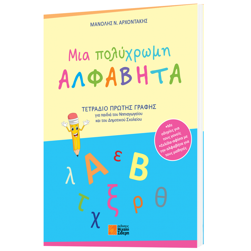 Ένα τετράδιο ασκήσεων και δραστηριοτήτων που απευθύνεται στα παιδιά του Νηπιαγωγείου και των μικρών τάξεων του Δημοτικού Σχολείου. Απλά, μεθοδικά και ευχάριστα βοηθά τα παιδιά να γνωρίσουν τα γράμματα της αλφαβήτας ώστε να μάθουν να τα διαβάζουν και να τα γράφουν χωρίς δυσκολία. Η χρήση των χρωμάτων, τα πλαίσια γραφής γύρω από τα γράμματα και τις λέξεις καθώς και οι εικόνες που υπάρχουν στις ασκήσεις του τετραδίου, βοηθούν στην κατανόηση του τρόπου γραφής κάθε γράμματος και συμβάλλουν αποτελεσματικά στην ανάπτυξη της δεξιότητας της γραφής