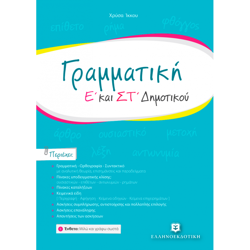 Γραμματική - Συντακτικό - Ορθογραφία με παραδείγματα και ασκήσεις για κάθε ενότητα του σχολικού βιβλίου • Παραγωγή Λόγου: Μαθαίνω πώς να αναπτύσσω κειμενικά είδη [Θεωρία - Σχεδιαγράμματα - Αναπτυγμένα θέματα παραγωγής λόγου του σχολικού βιβλίου] • Πίνακες με βασικό λεξιλόγιο • Πίνακες με Συνώνυμα - Αντώνυμα - Παράγωγα - Ομόρριζα • Κριτήρια Αξιολόγησης με ασκήσεις παραγωγής λόγου από το σχολικό βιβλίο • Απαντήσεις των Κριτηρίων Αξιολόγησης