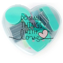 Στο διαφανές κουτί σε σχήμα καρδιάς υπάρχουν 6 μίνι αξεσουάρ, όπως ψαλίδι, γόμα, μαρκαδόροι σελίδας, κολλητική ταινία με δοσομετρητή, καθώς και συρραπτικό και συνδετήρες. Όλα όσα χρειάζεστε για να πάρετε μαζί σας, από το σπίτι μέχρι τη βιβλιοθήκη ή το σχολείο, τη δουλειά και οπουδήποτε αλλού σας πάει η ζωή.