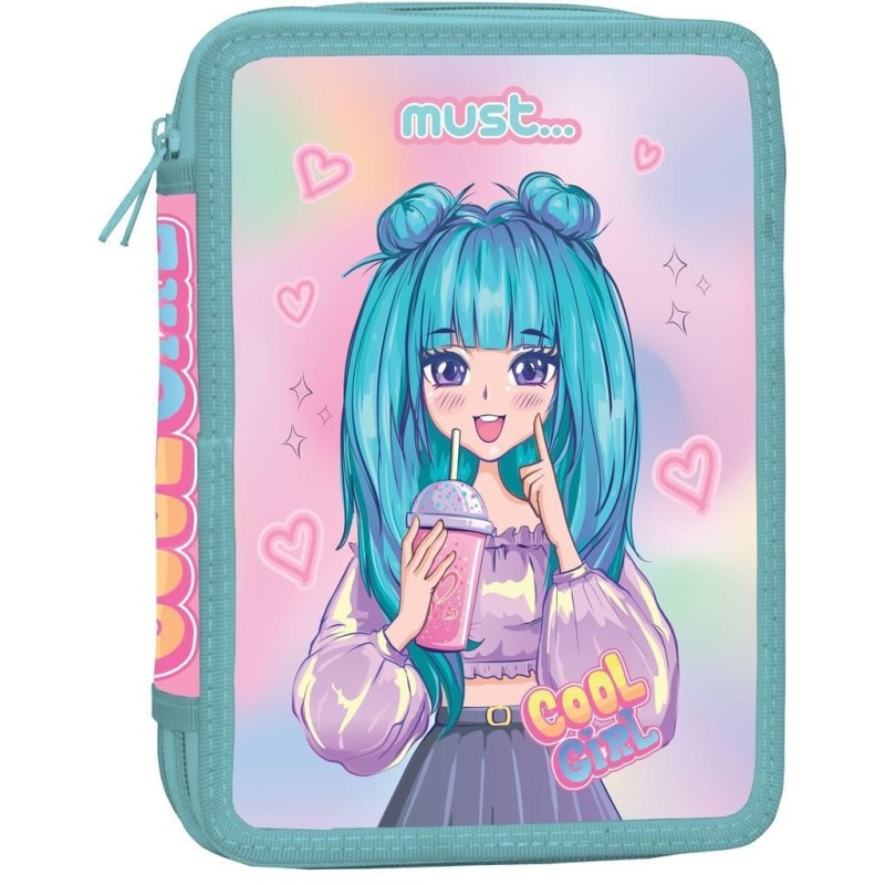 Η Σχολική Κασετίνα Διπλή Γεμάτη Must Cool Girl περιέχει στυλό, μολύβι, γόμα, ξύστρα, χάρακες, ξυλομπογιές και μαρκαδόρους